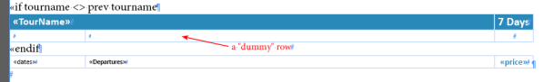Table fragments can contain merged cells. Since merging cells horizontally in a single-row table can change the underlying column count and prevent the fragment from being joined with the current table, an extra row — a “dummy” row — can be added to lock the fragment’s original column count. To be seen as a dummy, the row must be completely empty (contain no text or pictures). Dummy rows are ignored by InData and are never added to the current table.